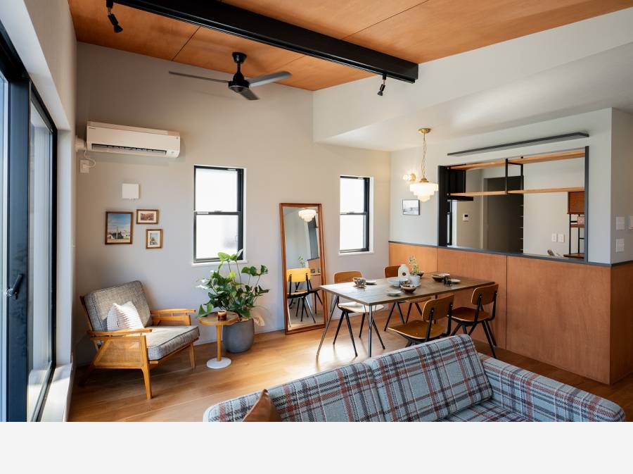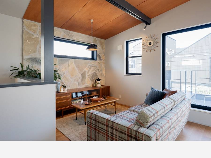 室内は、石張りの壁や板張り勾配天井が、時代を超えたミッドセンチュリーの雰囲気を感じさせます。さらに、ブラックチェリーの床が時を経るごとに深みを増し、上質な住空間を演出します。キッチンには大容量のパントリーを備え、日々の生活を支える機能性も魅力です。