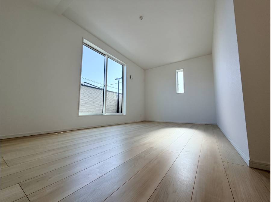 ベットルームは9.2帖バルコニーに出るための大きな窓が部屋全体を明るく照らしてくれます。天井が屋根勾配で、部屋を広く演出しています。
