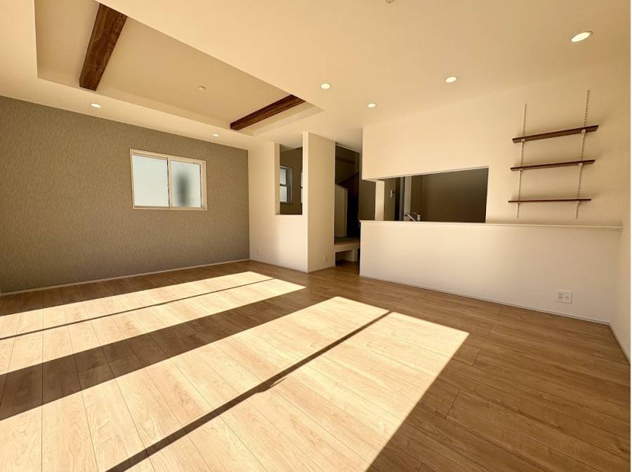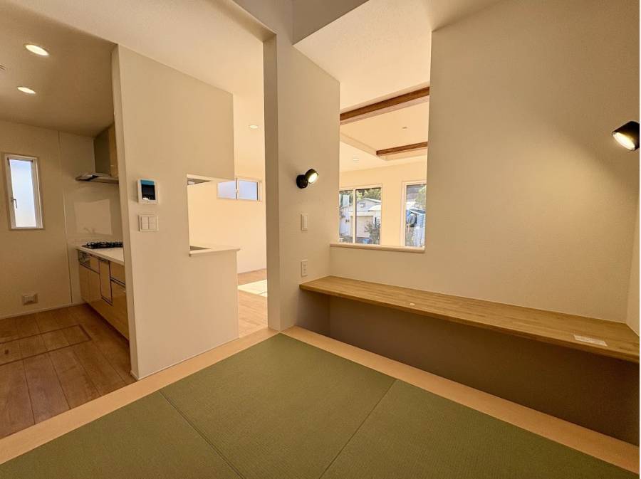 南向きの立地が魅力で、陽当たりが良好。日中は室内が明るく、照明いらずで過ごせる心地よい空間です。1階のLDKには、お子様が遊べる畳スペースや勉強ができるワークスペースが設けられており、家族の暮らしを考えた工夫が詰まっています。