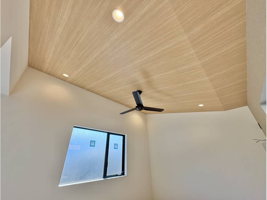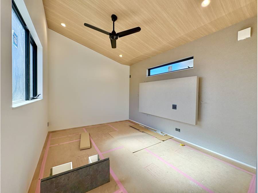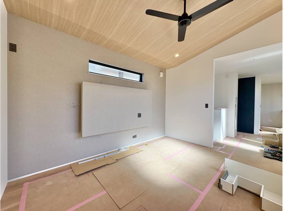 2階リビングの勾配天井や壁掛けテレビ対応の設計が魅力的です。