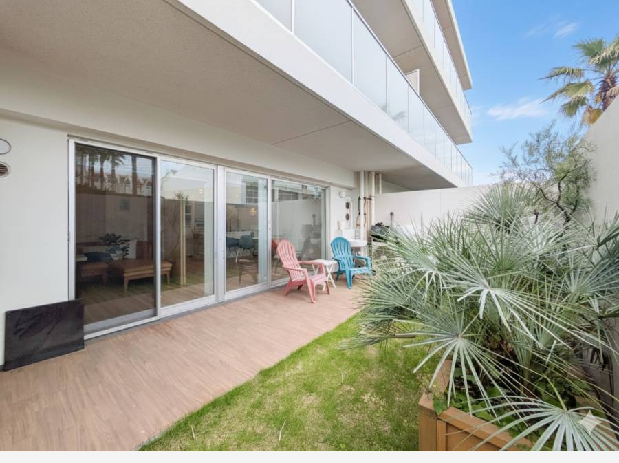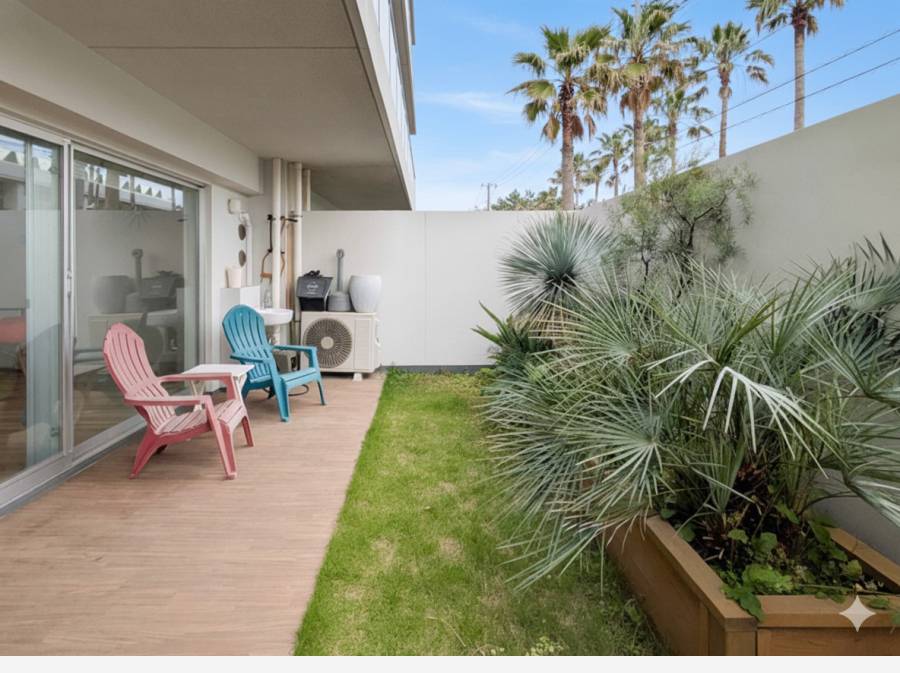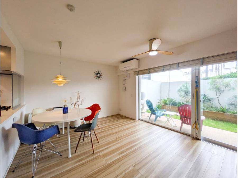 1階のお部屋で専用庭付きとなっており、開放的な空間を楽しめます。リゾートのような雰囲気があり、居住用としてはもちろん、セカンドハウスとしての利用もおすすめです。また、ビーチまで徒歩5分(約400m)の距離にあり、マリンスポーツや海辺の散歩を気軽に楽しめる魅力的な立地です。
