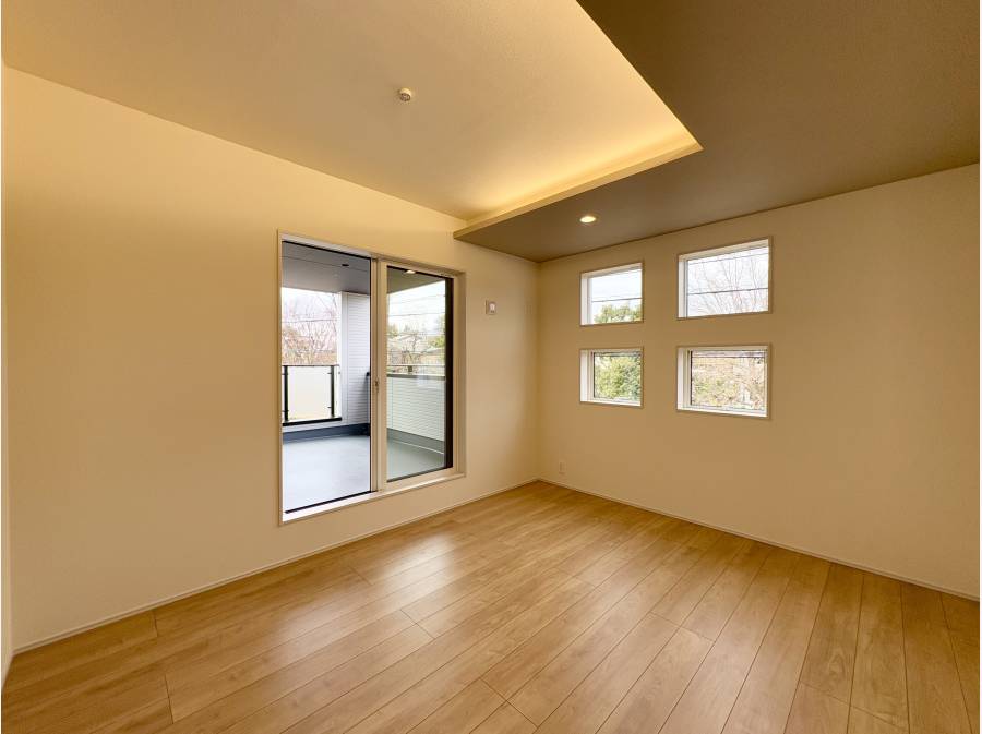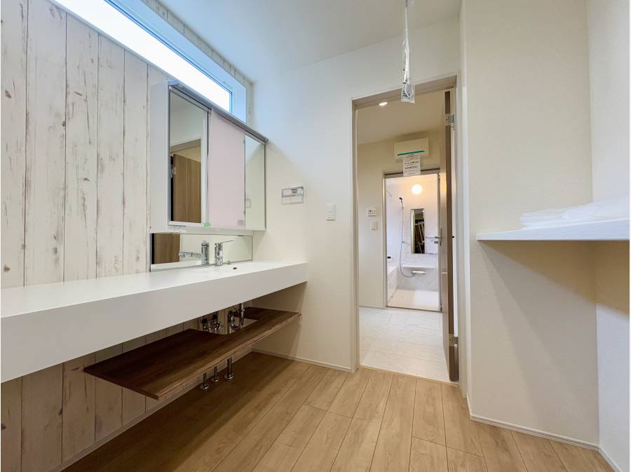 20.0帖の広々LDKは、床暖房やリビング全体を見渡せる対面キッチンを採用し、吹き抜けが明るく開放的な空間を演出。さらに、玄関土間収納や雨の日に便利なインナーバルコニーなど、暮らしを支える工夫も随所に取り入れています。