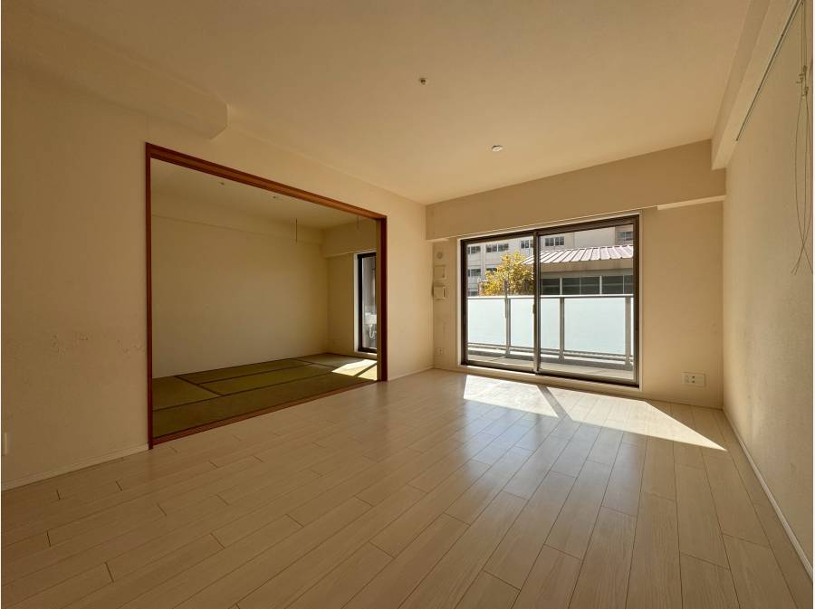 南西向きのお部屋は陽当たりが良好で、冬場でも暖かく快適。約14.1帖のLDKは、隣接の和室を開放することで約20.1帖の広々とした空間になります。対面式キッチンにはディスポーザーが付いており、お子様を見守りながら安心して料理が楽しめます。