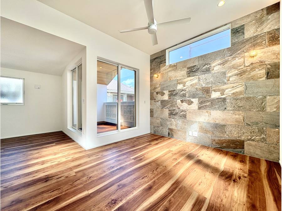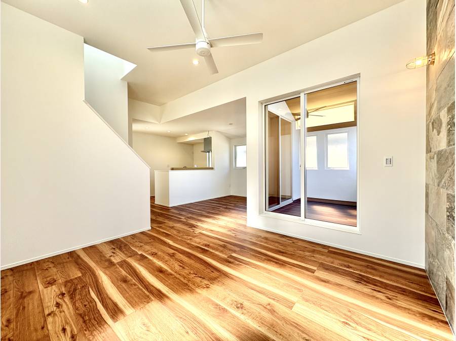 吹き抜けと約2.9mの天井高が圧倒的な開放感を演出し、シーリングファンが心地よい空気を巡らせます。