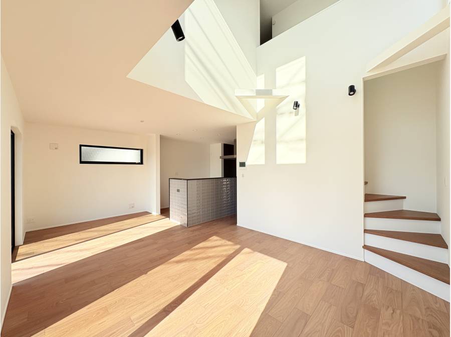 約18.8帖のLDKは吹き抜けを採用し、明るく伸びやかな空間を演出。アイランドキッチンは回遊動線を備え、家族のコミュニケーションを自然に育む設計となっています。