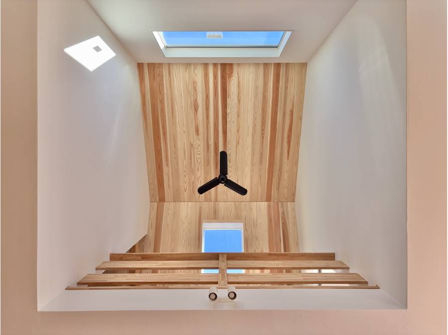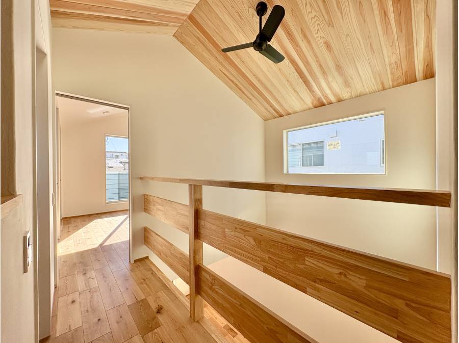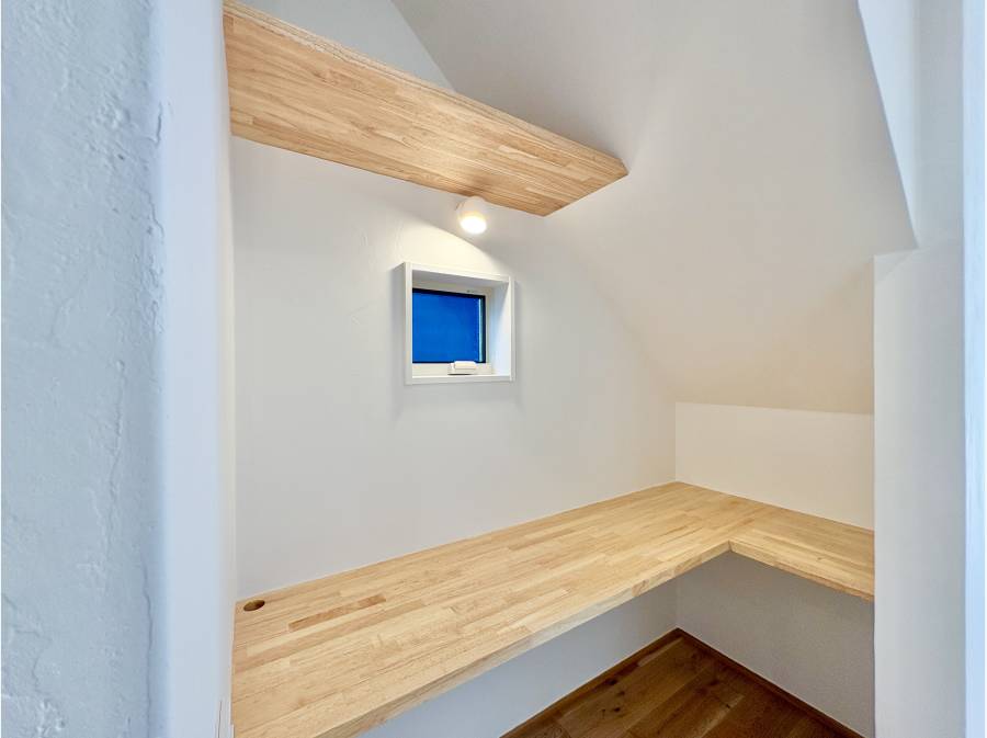 白い珪藻土の壁はコーナーが柔らかく丸みを帯び、無垢突板のフローリングが温もりを感じさせます。