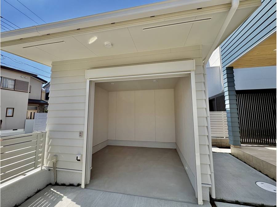 車は2台並列で停めることができ、その上バイクや自転車のガレージも付いております。