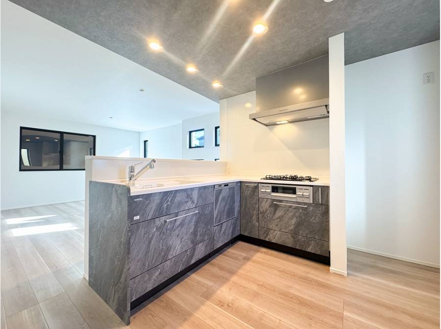 LDKの中心には、お部屋全体を見渡せる広々としたL字型キッチン。