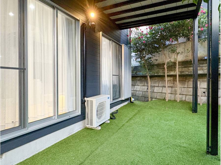 まず目に飛び込むのは鮮やかなグリーンカーペットのお庭。