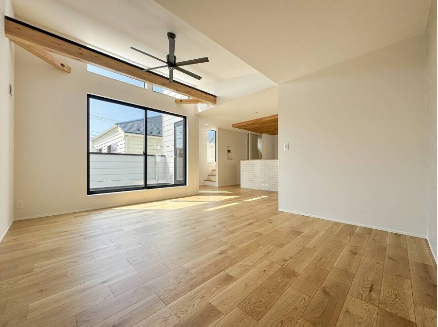 陽光溢れるLDKで優雅に回るシーリングファン