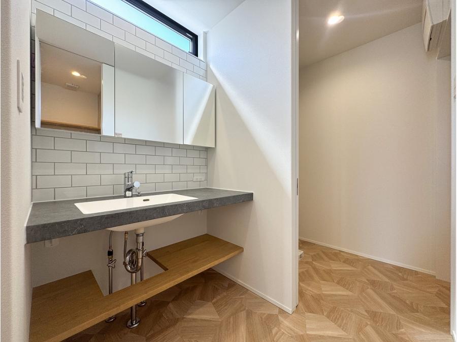 白タイルのキッチンカウンターや創作洗面台などディティールへのこだわりも注目したい。