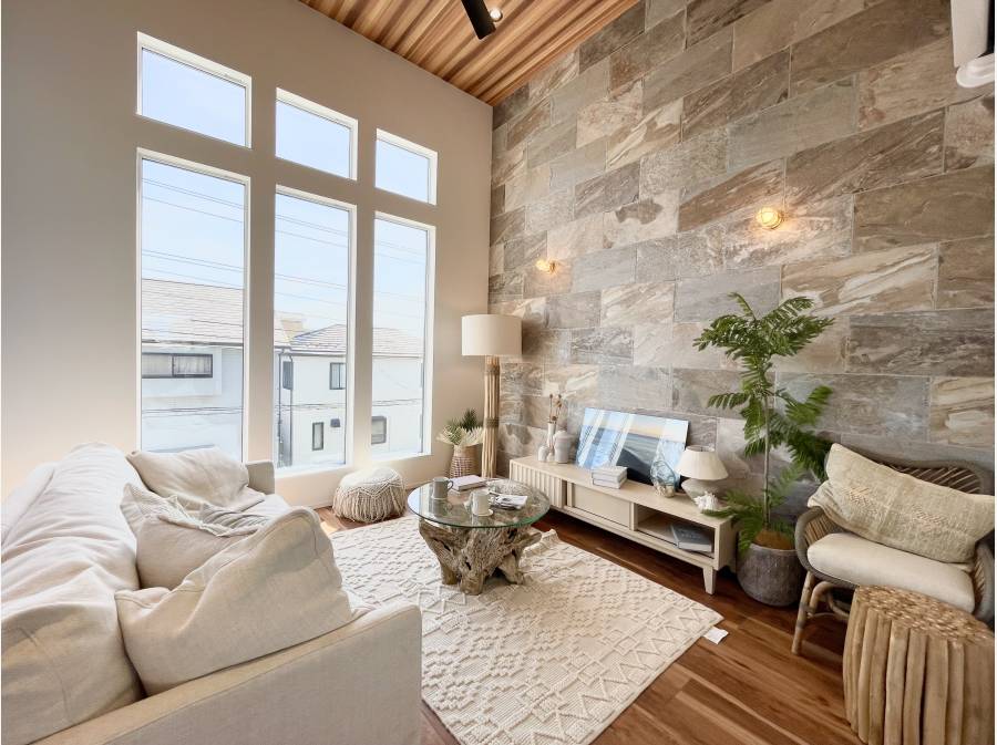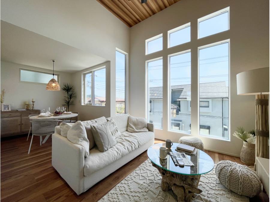 約26.3帖の広々としたLDKは、2.8mの高天井とシーリングファンがリゾート地のような洗練された空間を演出。