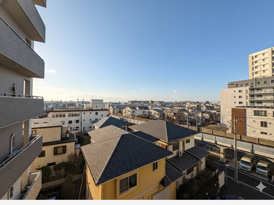 この物件の魅力は、南向き角部屋ならではの開放感と明るい日当たり。そして、5階部分のバルコニーからは、晴れた日に江の島を遠くに望むことができる、心癒される景色が広がります。