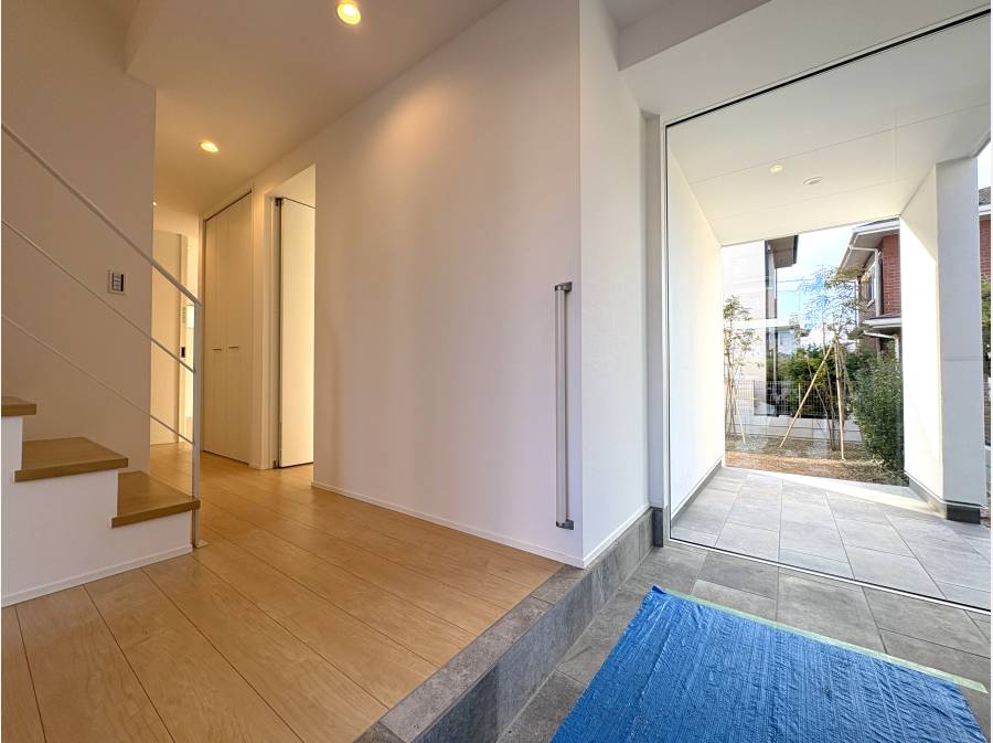 玄関を開けると広い土間の先に中庭のようなテラス。
