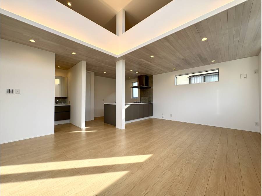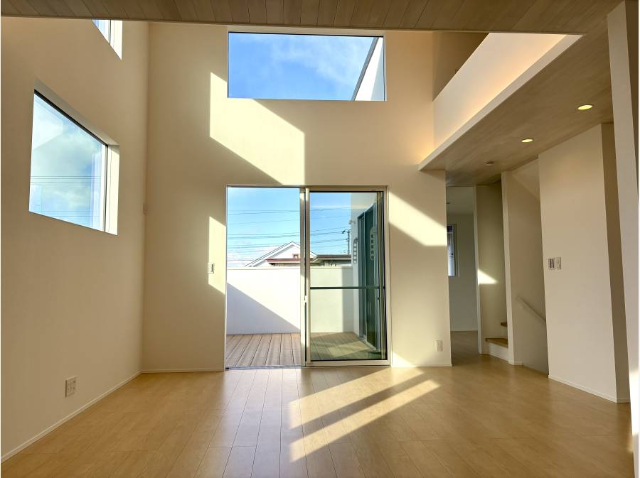 2階の吹き抜けリビングは、上から柔らかな光が降り注ぎ、家族が集う時間も一人ひとりの時間も心地よく包み込む空間です。