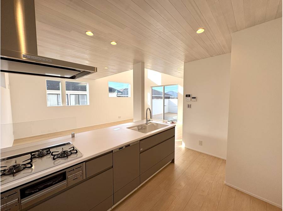 板張り天井のダイニングキッチンは、昼と夜で異なる表情を見せ、照明との組み合わせで落ち着いた雰囲気を演出します。