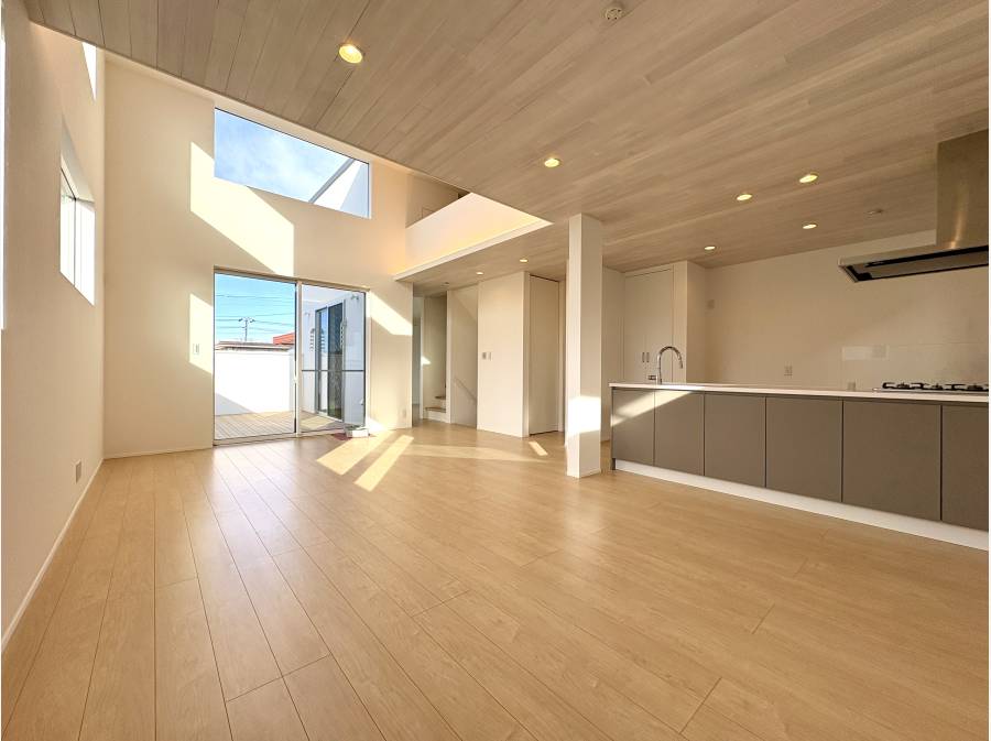 玄関から続く土間空間の先にはテラスを配置し、内外が自然につながる設計が魅力。帰宅した瞬間から視線が抜け、住まい全体に奥行きを感じられる工夫が施されています。