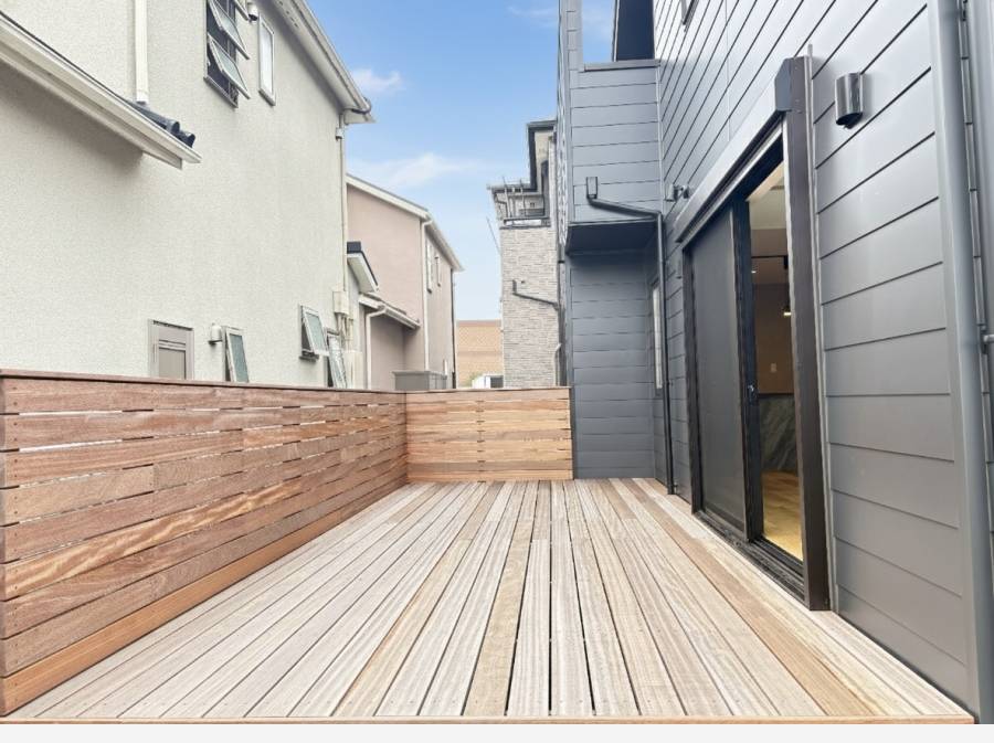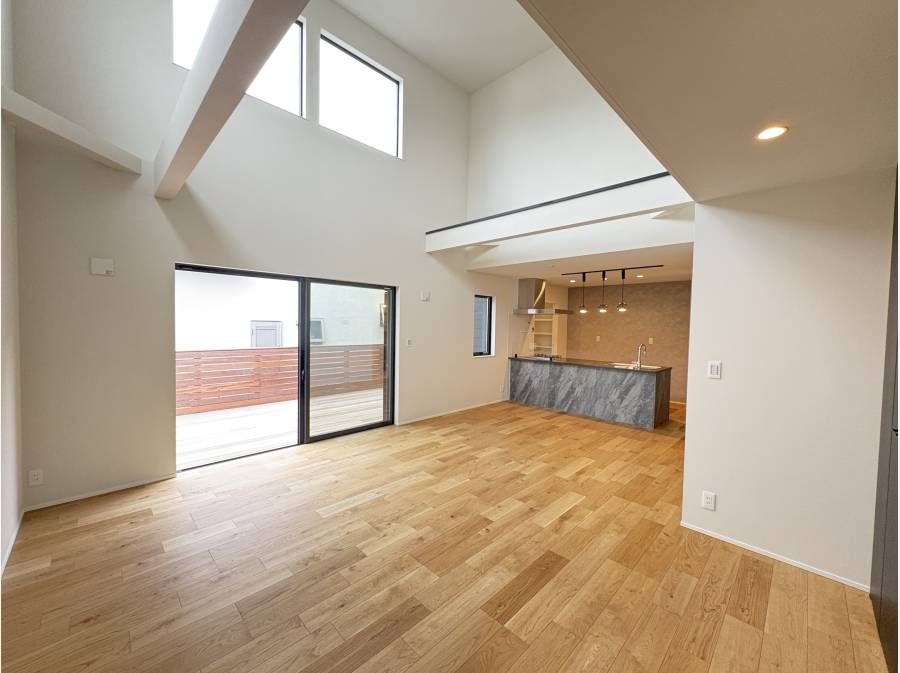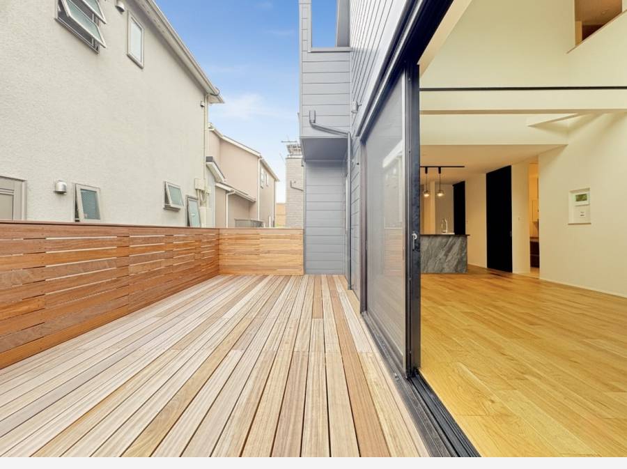 敷地面積は約41.90坪、南東側道路に面しており、陽当たりも良好です。LDKは20帖を超える広さがあり、大型の吹抜けが開放感と明るさをプラス。バルコニーにはウッドデッキが敷かれ、まるでリゾート地にいるかのような雰囲気を味わえます。