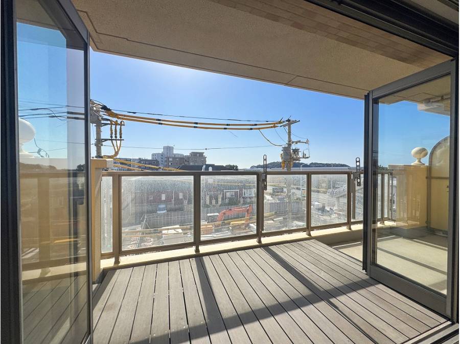 セカンドリビングのようなオープンエアバルコニーから、江ノ島を望むことが出来る4階のお部屋。