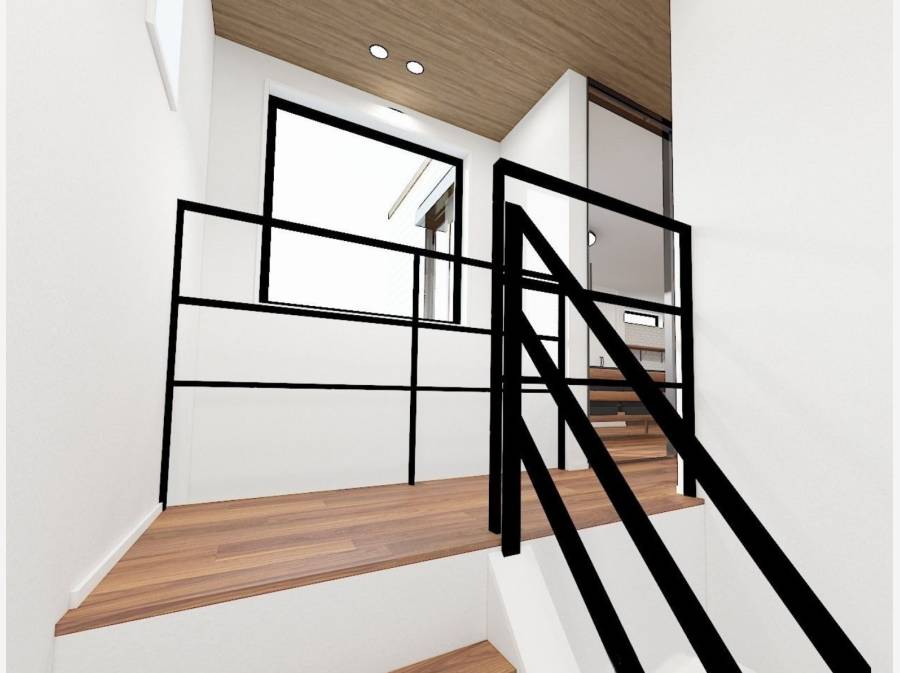 20.4帖の広々としたLDKは、天然木の温もりとアイアンの質感が調和し、海外のカフェのようなおしゃれな空間が広がります。玄関の吹抜けやデザイン階段が開放感を演出し、パントリーや食洗機など、日々の家事をサポートする設備も揃っています。