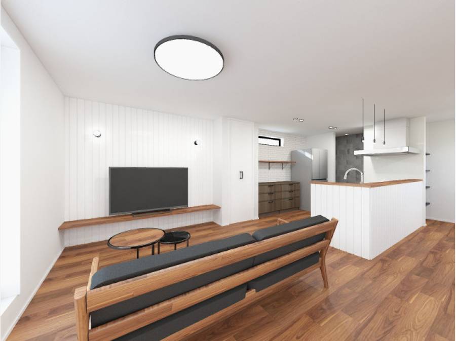 この物件の注目ポイントは、20帖以上の広々としたLDK。天井を高く見せる「ハイドア」を採用し、家族が集う場所にゆとりある空間を実現しました。また、玄関ホールは吹き抜け構造で、デザイン階段とアイアン手摺がスタイリッシュな印象を与えます。