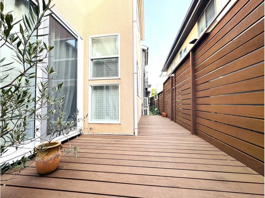 1階の居室からウッドデッキへ直接出られる設計で、光と風を感じながらセカンドリビングとしても活用可能です。物語に出てくるような、やさしい雰囲気の一邸です。