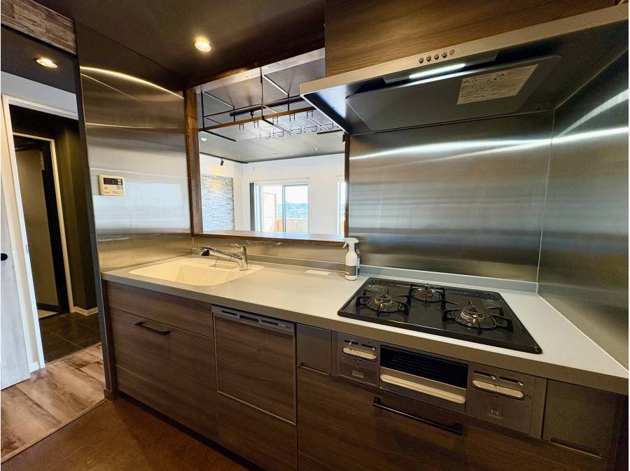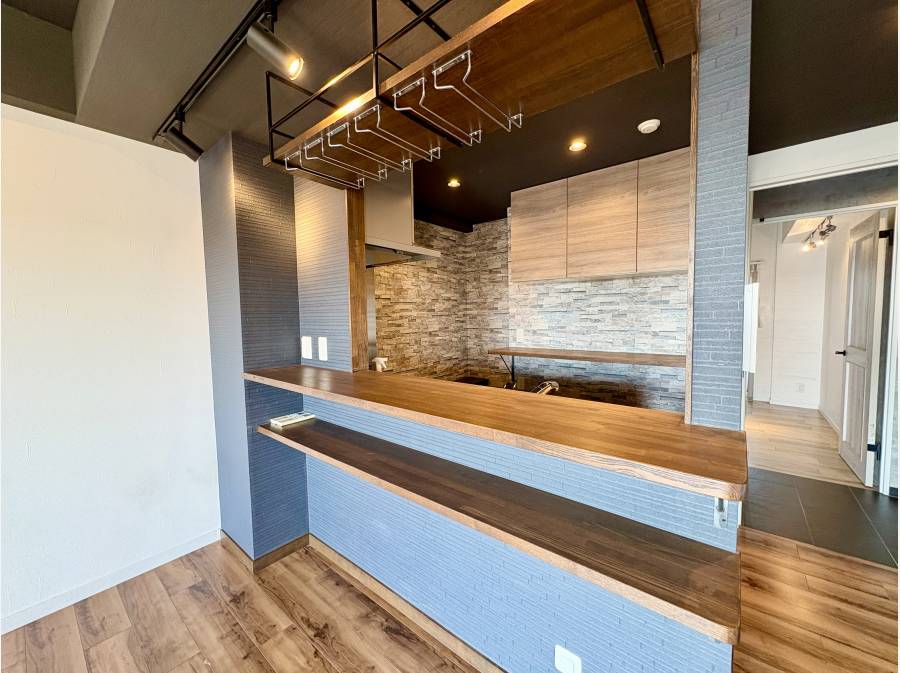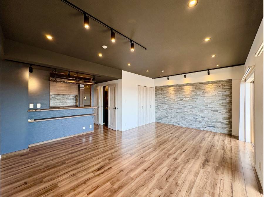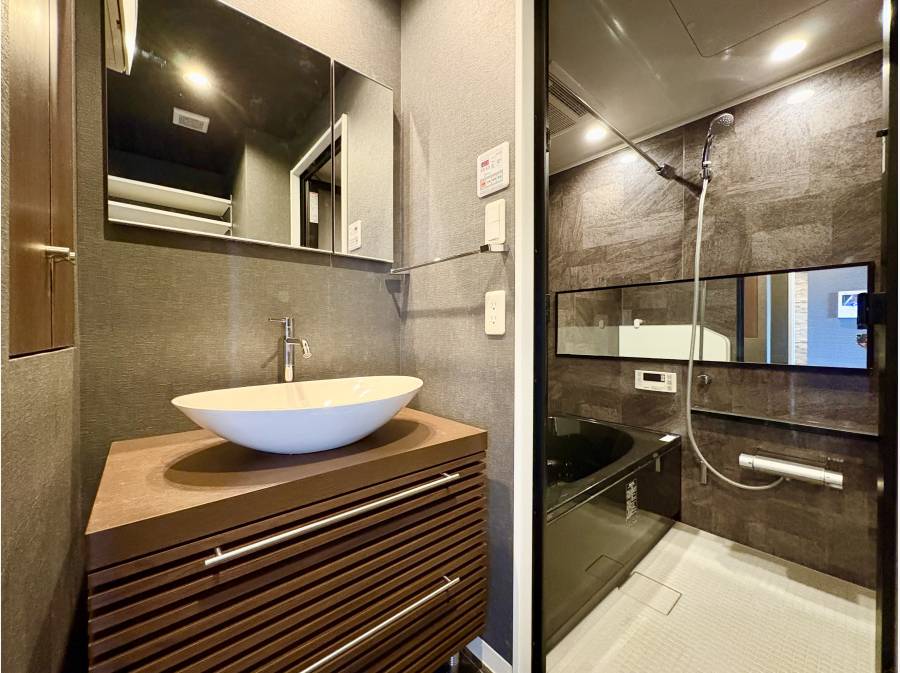 石張りのアクセントウォールやタイル床を採用した室内は、ホテルのような洗練されたデザインが特徴。約19帖の広々としたLDKには開放感あふれるオープンキッチンが配置され、造作の洗面台など細部までこだわりが感じられます。