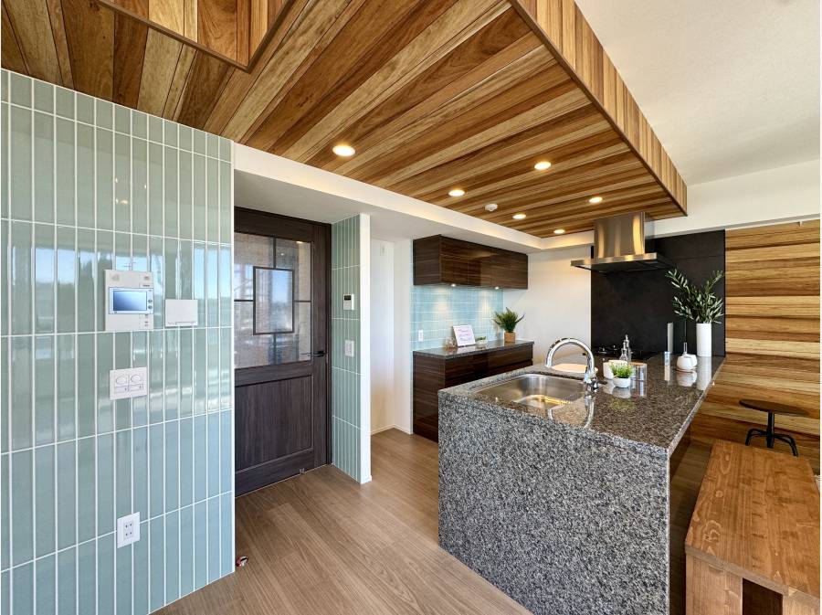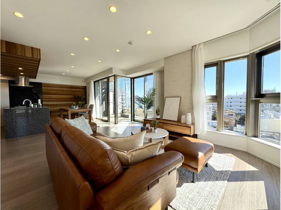 最上階・角住戸の特別な開放感と、約26.6帖の広々としたLDKから眺める青い海が、毎日を特別なものにします。