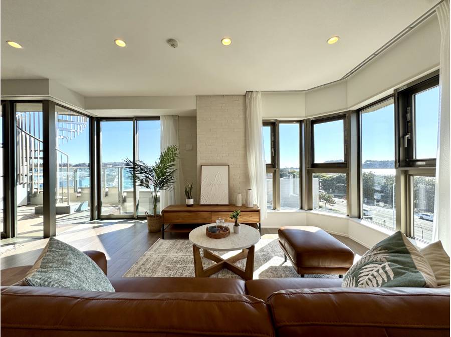 【初公開】2025年グッドデザイン賞受賞。開放的なデザインと海が見える最上階の角部屋住戸。