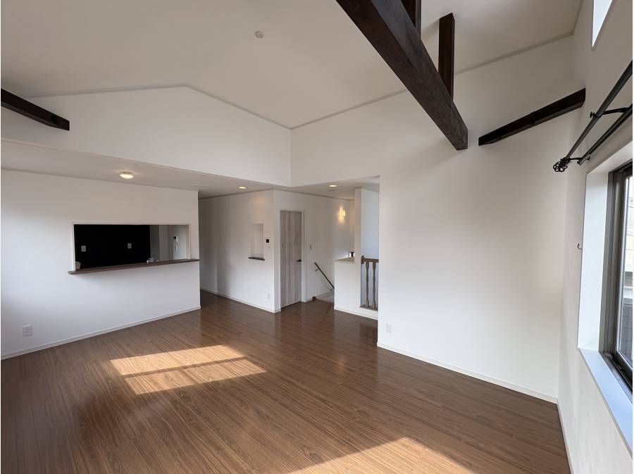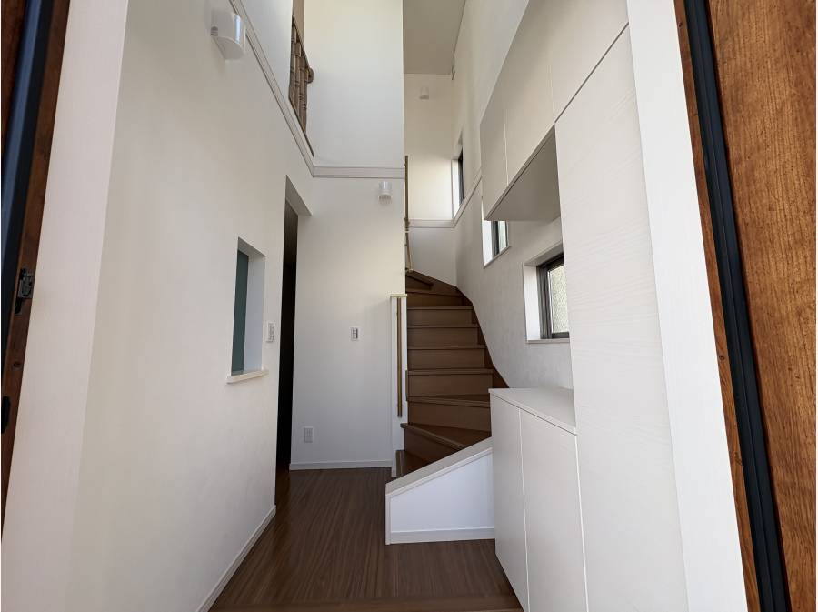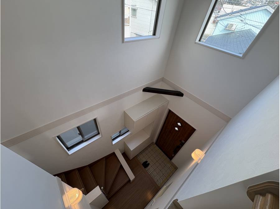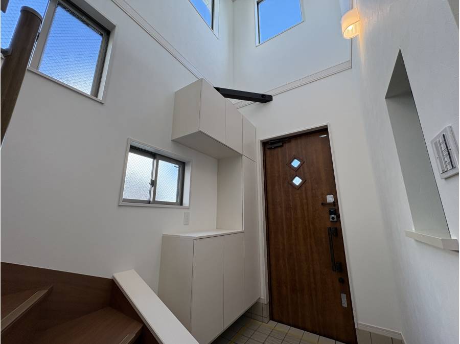 玄関上部が吹き抜けとなっており、2階のリビングとつながる開放感あふれる空間です。風通しも良く、居心地の良い雰囲気が魅力的です。間取りは4LDKでトイレは2か所設置されており、日当たりも良好です。幹線道路の467号線から1本奥に入った静かな住宅街に位置しています。