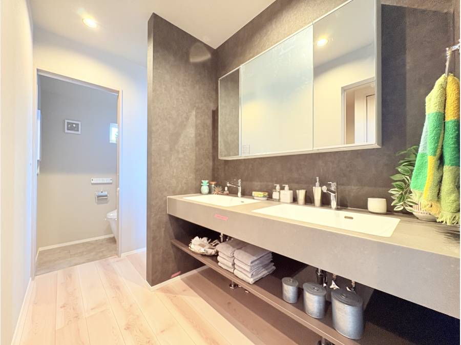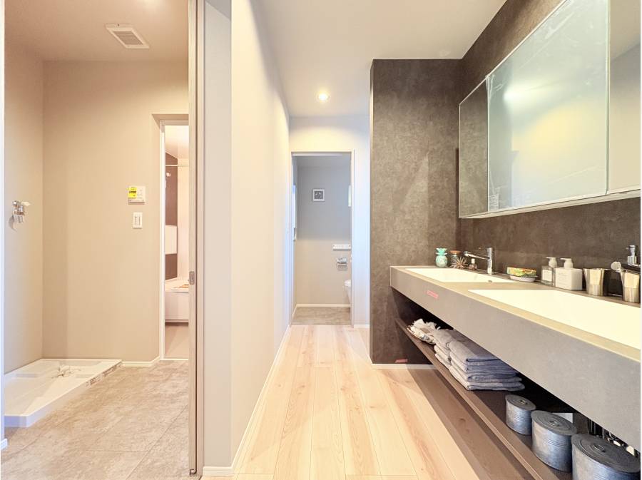 洗面スペースには2ボウルの洗面化粧台を採用し、回遊動線を意識した家事動線やプライバシーへの配慮が光る設計です。快適な住空間を、ぜひ現地でご確認ください。