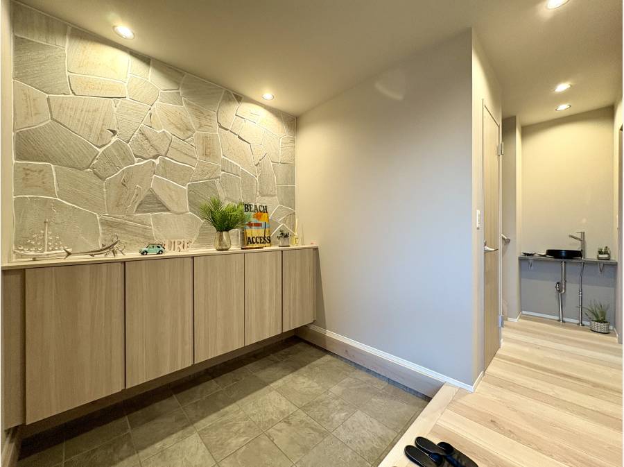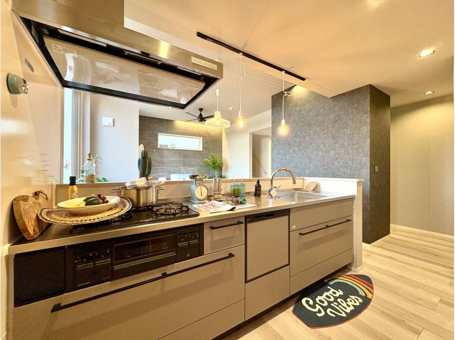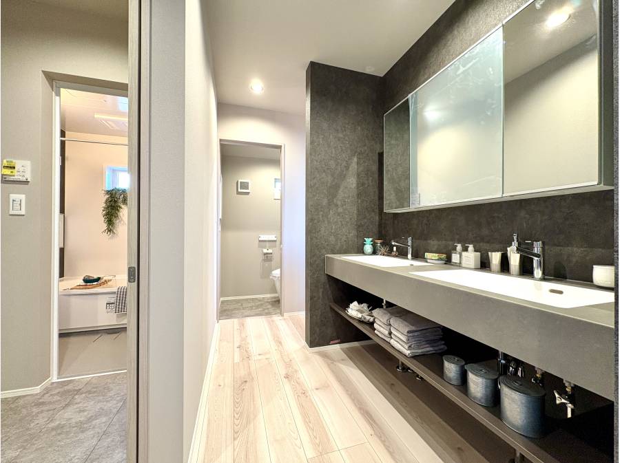 キッチンと洗面室を集中させた回遊動線により家事効率を高め、帰宅後すぐに手が洗えるセカンド洗面を設けるなど、暮らしを整える工夫が随所に宿ります。