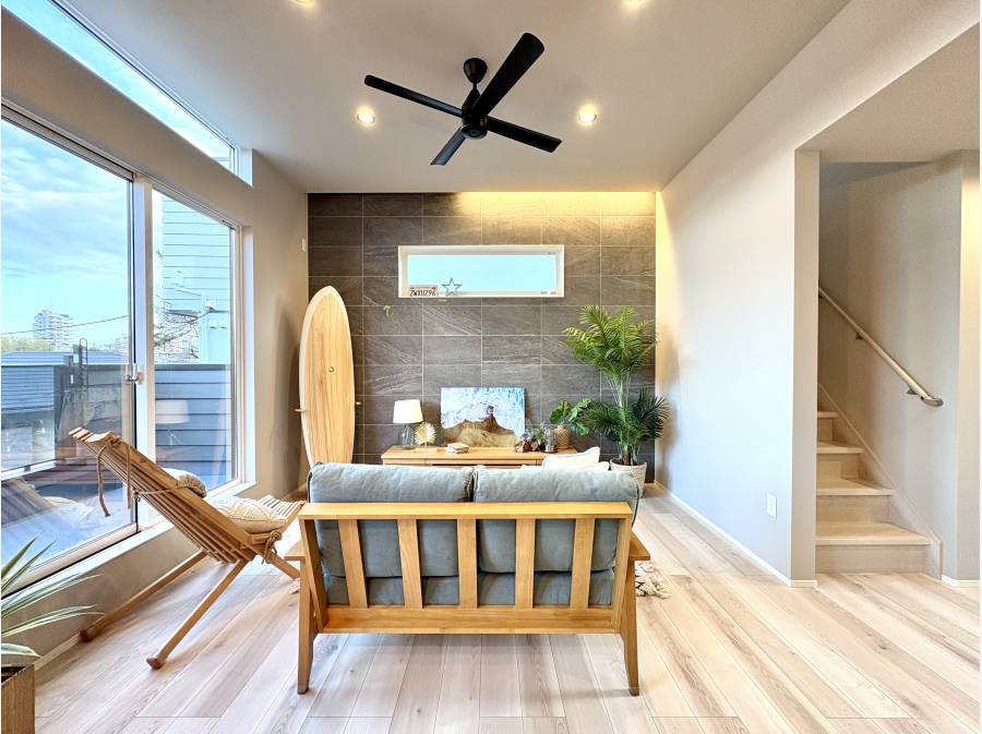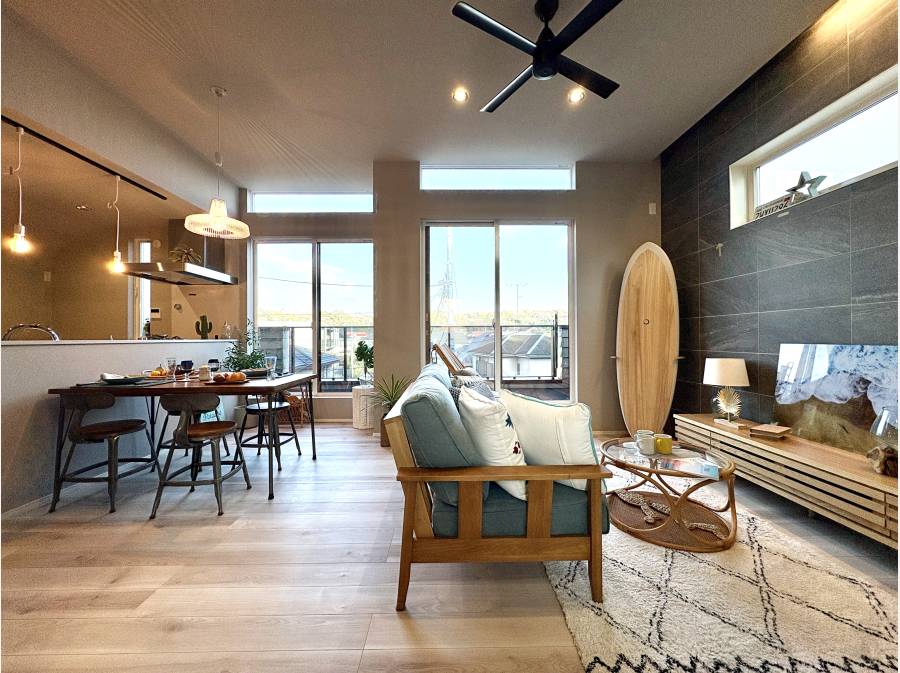 リビングは天井高約2.9mを確保し、勾配天井と高窓、シーリングファンがリズムを刻む空間