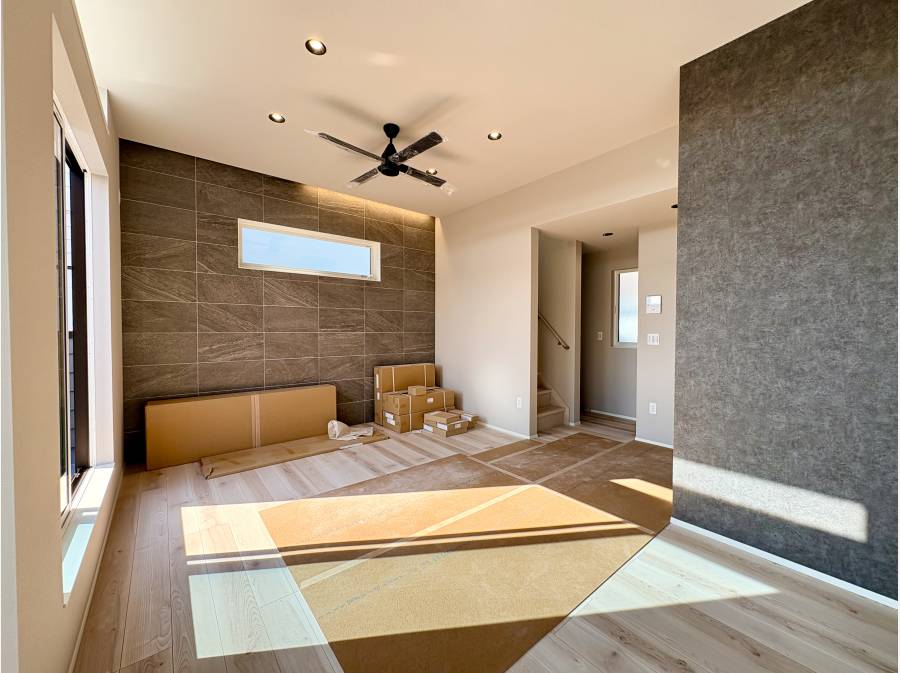 この住宅の魅力の一つは、約2.9mの勾配天井を採用したリビングダイニング。シーリングファンと高窓から差し込む光が、心地よい開放感を演出し、家族のくつろぎの時間をより豊かにします。