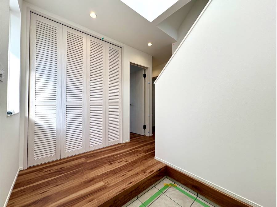 光が降り注ぐ玄関吹き抜けや、家事の負担を軽減するリネン棚など、暮らしを整える工夫が随所に宿ります。