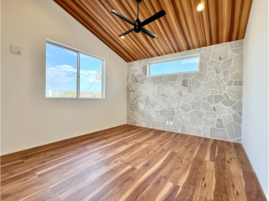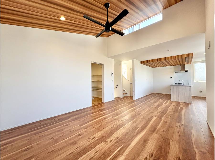 天井高約2.9mを確保し、勾配天井と高窓、シーリングファンがリズムを刻む約20.8帖の空間は、まさにカリフォルニア・リゾートの心地よさ。