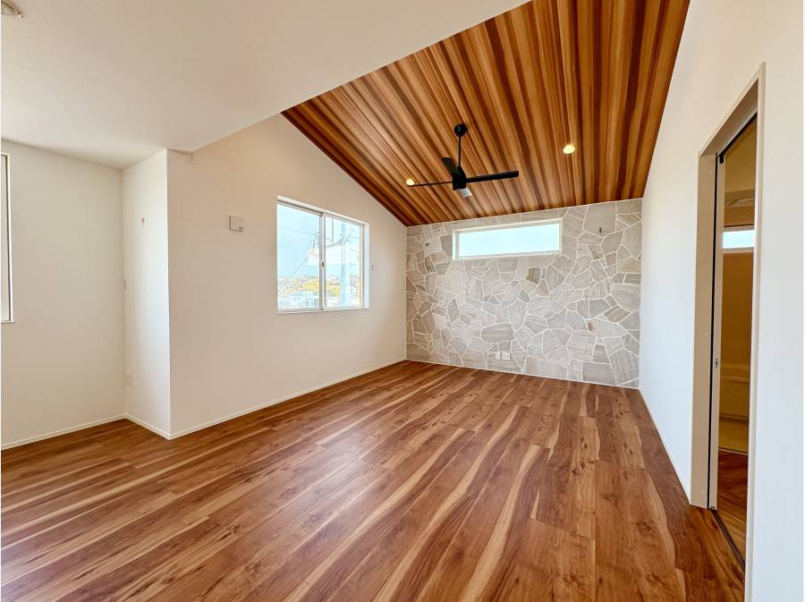 住まいは北西・北東の二方が道路に面した角地に位置し、開放感と採光に優れたロケーションが魅力です。インテリアには洗練された「カリフォルニアスタイル」を採用し、石目調のアクセントウォールが空間に深みを与えるとともに、フルフラットなペニンシュラキッチンはバーカウンターとしても楽しめ、家族や友人との時間を彩ります。