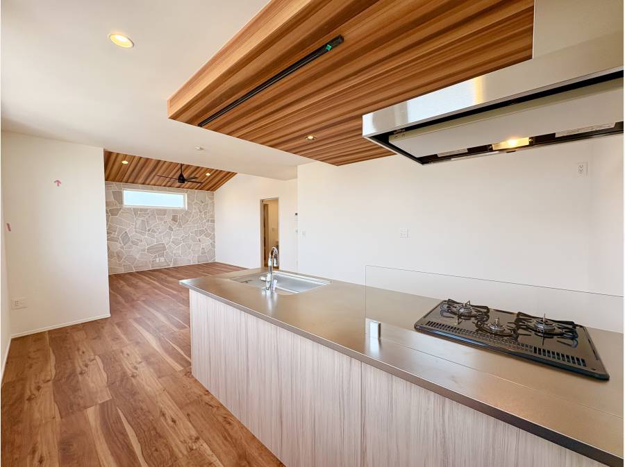本物件の魅力は、約20.8帖の広さを誇るLDK空間にあります。最大約3.9mもの高さがある勾配天井を採用し、シーリングファンが回るリビングは、高窓から降り注ぐ陽光によって、リゾートホテルのような快適さを日常にもたらします。