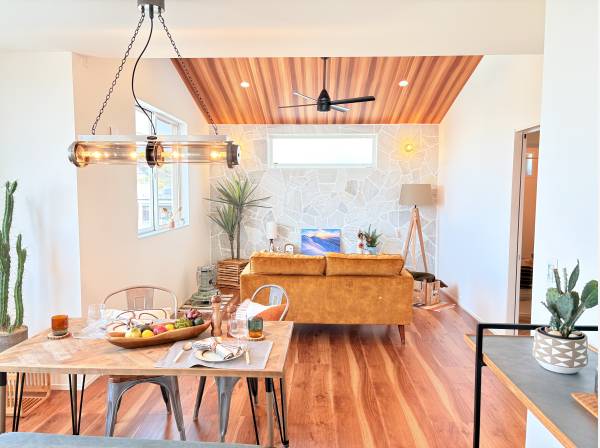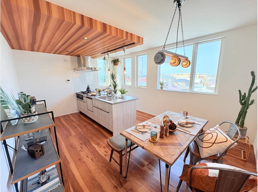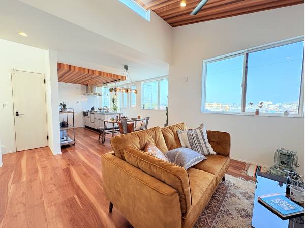 勾配天井が特徴の開放的なLDKは、家族でゆったりと過ごせる空間を演出。