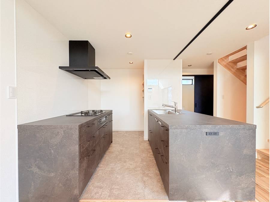 キッチンにはグラフテクトを採用し、広々とした両面使用可能な作業スペースを確保。スタイリッシュで機能性を兼ね備えた仕上がりです。