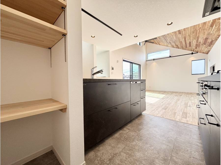 勾配天井がもたらす広がりは、実際の帖数以上のゆとりを実感させてくれます。作業スペースが広く、収納力豊富なグラフテクトのキッチンは日々の家事を快適にサポートします。