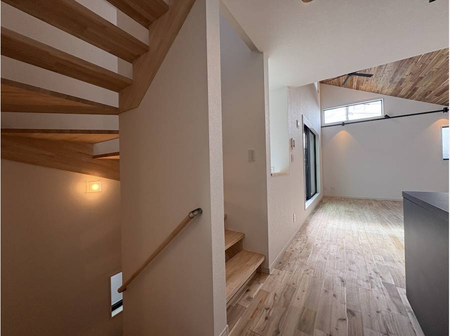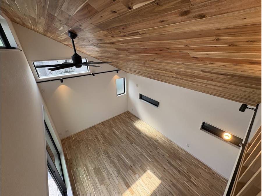 一歩足を踏み入れると、アカシアの無垢材を使用した床と天井が温かく迎えてくれます。天然木ならではの質感と香りに包まれる暮らしを想像してみてください。