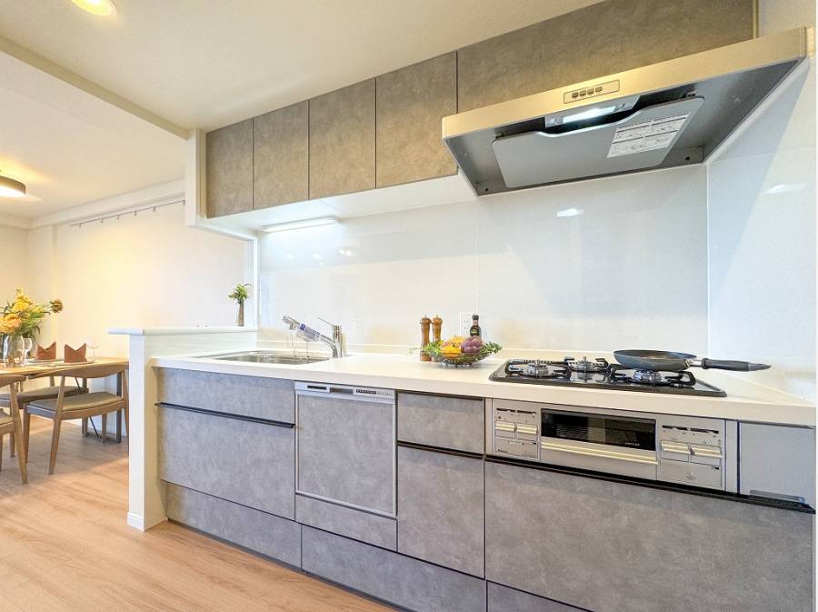 食洗機、浄水器、ディスポーザーを備えた便利なキッチン、リビングダイニングには床暖房が付いています。