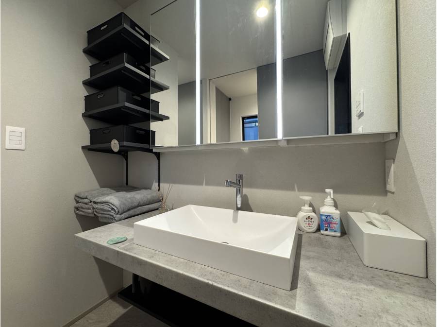 吹き抜けの開放感とプライバシーが調和した住まいが誕生しました。憧れのアイランドキッチン「グラフテクト」を中心に据えたLDKは、機能性とデザイン性を兼ね備えた空間。さらに書斎やスタディースペースもあり、意匠美と実用性が見事に共存しています。玄関には造り付けのベンチを配置し、利便性とデザインの両方に配慮。内装素材や照明計画に至るまで、プロのこだわりが息づいています。