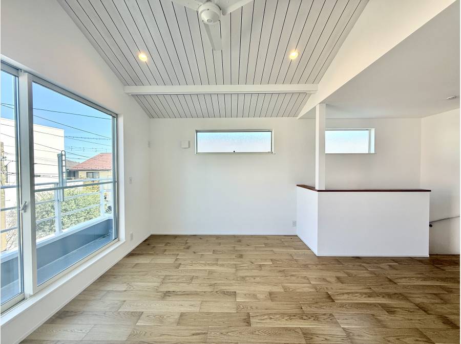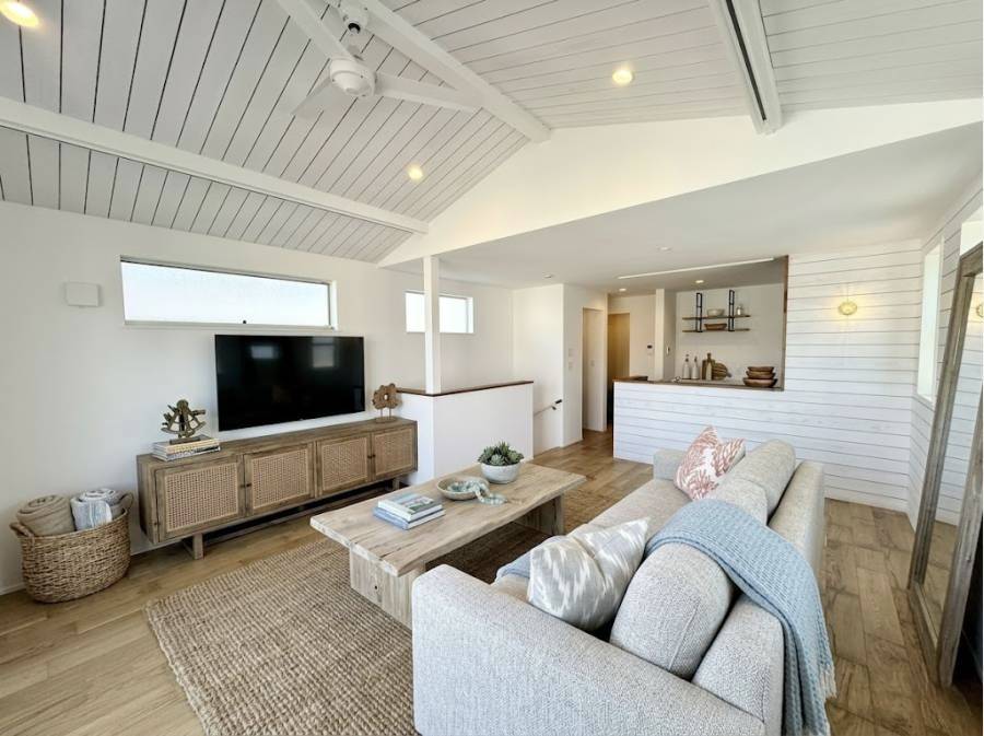 2階には、21帖超の広々としたLDKが広がり、サーフショップのような温かい雰囲気が漂います。高天井にゆったりと回るシーリングファンが、毎日の暮らしを特別なものに演出します。くつろぐ時間がさらに心地よい、開放的な空間です。