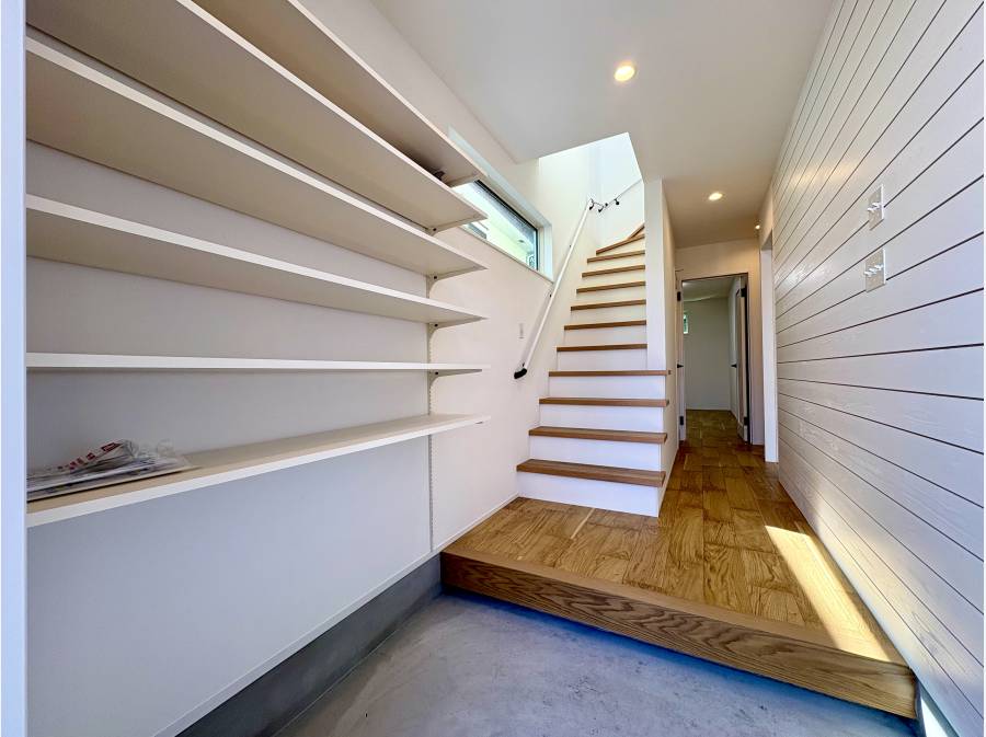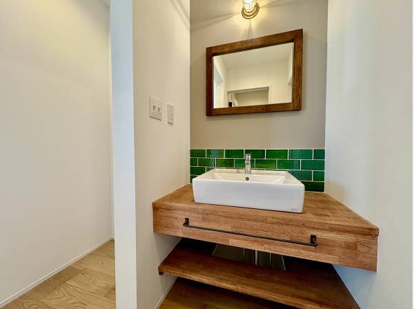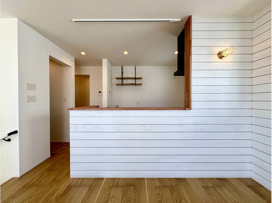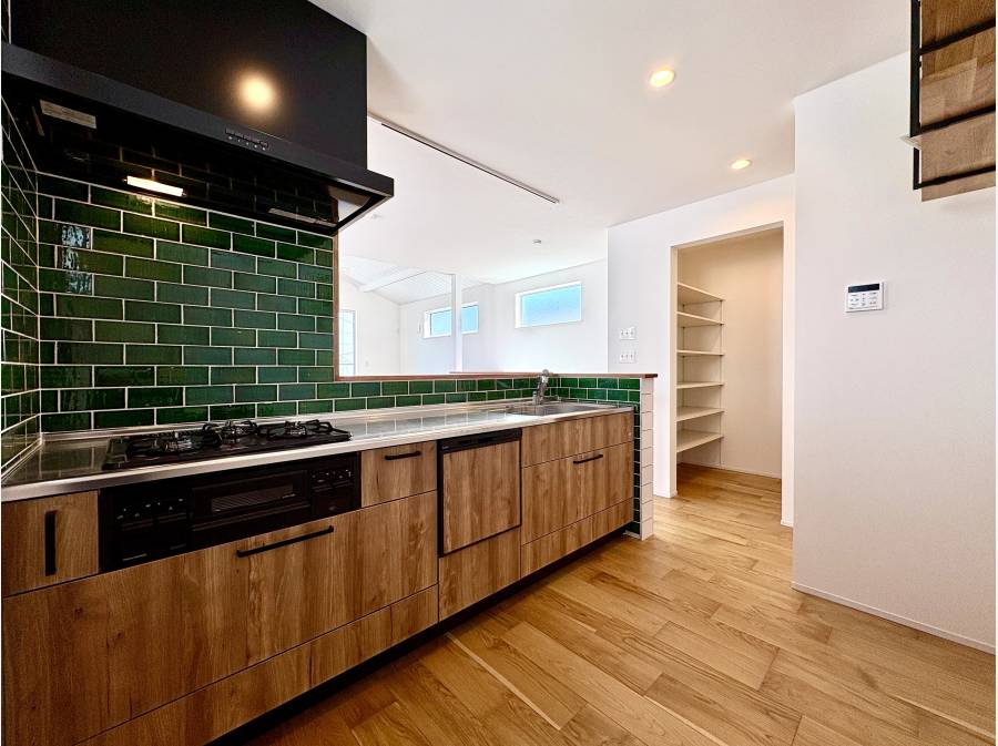 室内はタイルを用いたかわいいデザインの対面キッチンやリビング階段、板張りなど随所にこだわりが散りばめられています。
