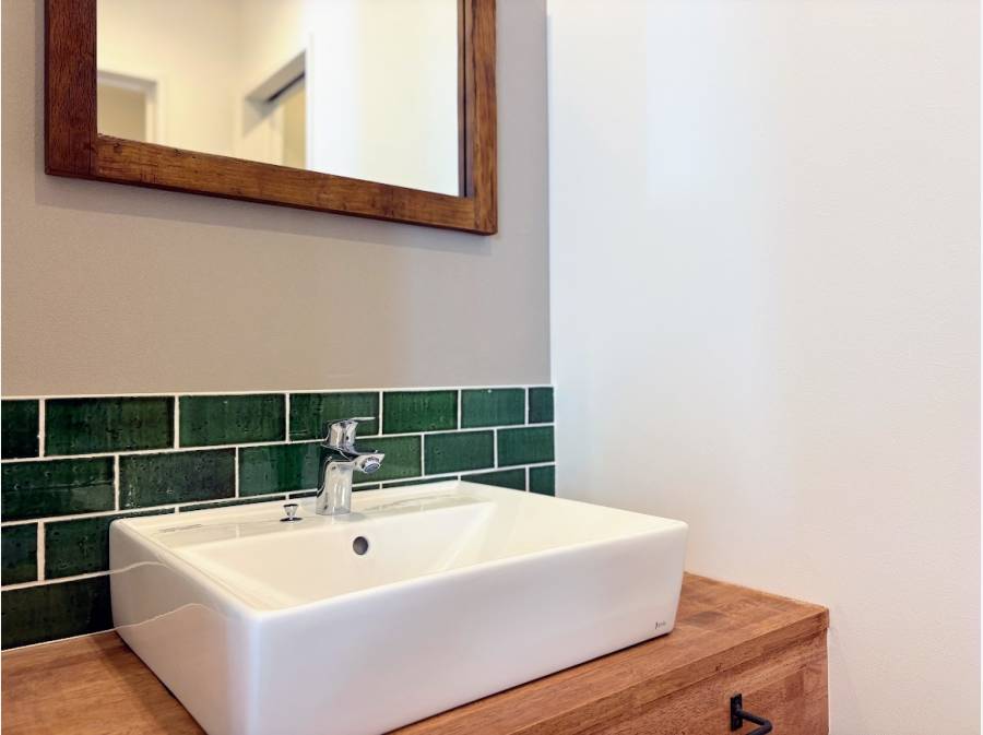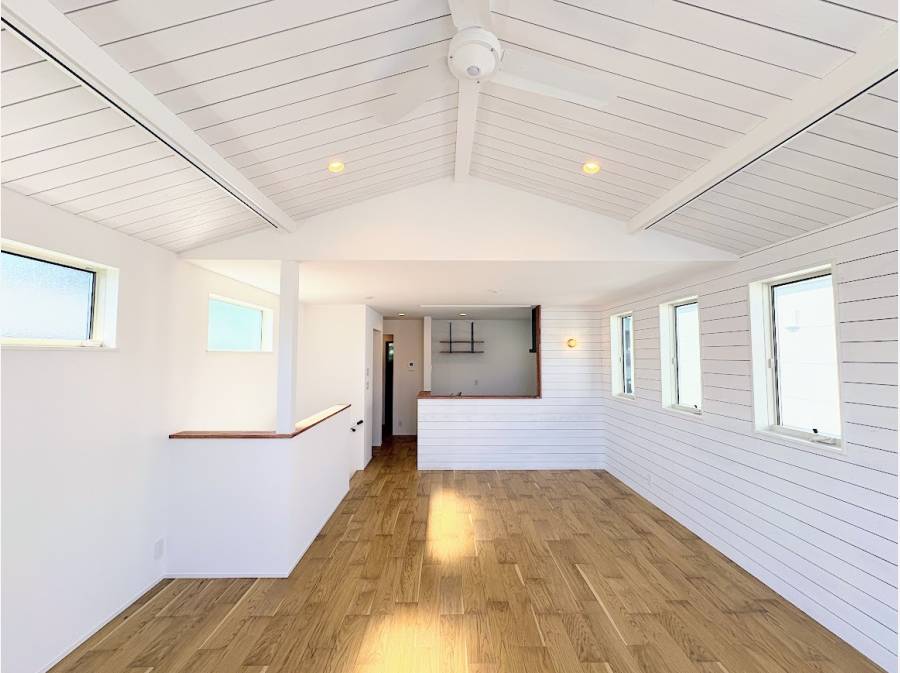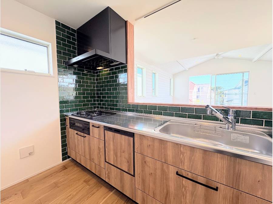 約21帖のLDKは勾配天井が広がりを感じさせ、陽光がたっぷりと差し込みます。タイル張りのキッチンや造作洗面台など、細部にまでこだわりが光る空間です。