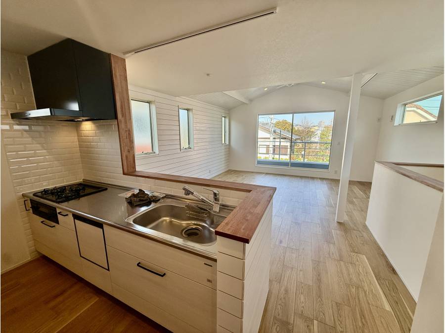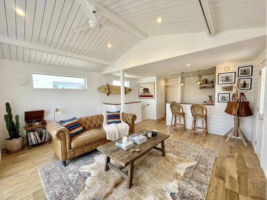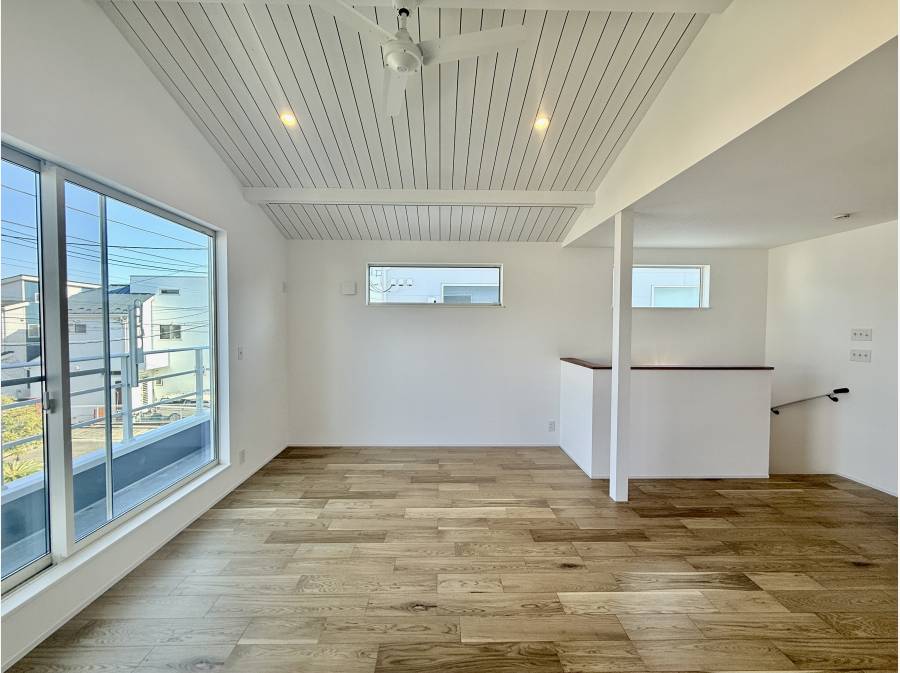 2階には、21帖超の広々としたLDKが広がり、サーフショップを思わせる温かみのある雰囲気に包まれています。高天井にゆったりと回るシーリングファンが、非日常感を演出。リビングでのひとときが、まるで映画のワンシーンのように特別な時間へと変わります。