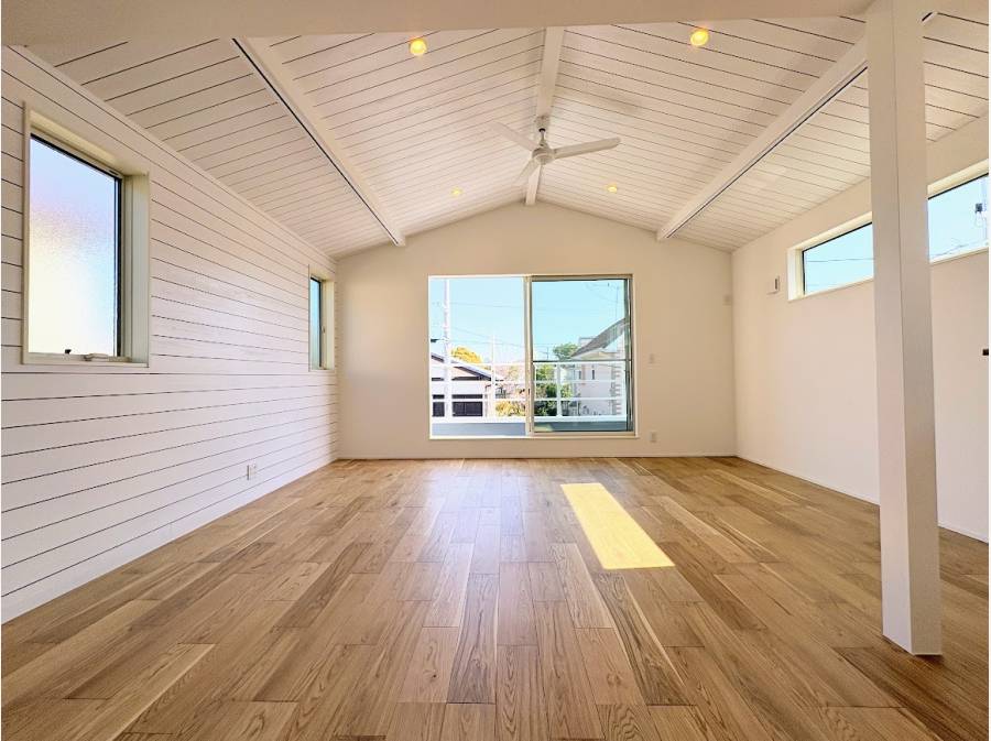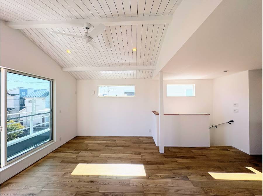 白を基調とした開放的な約21帖の勾配天井が魅力的なデザイナーズ物件