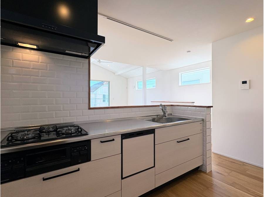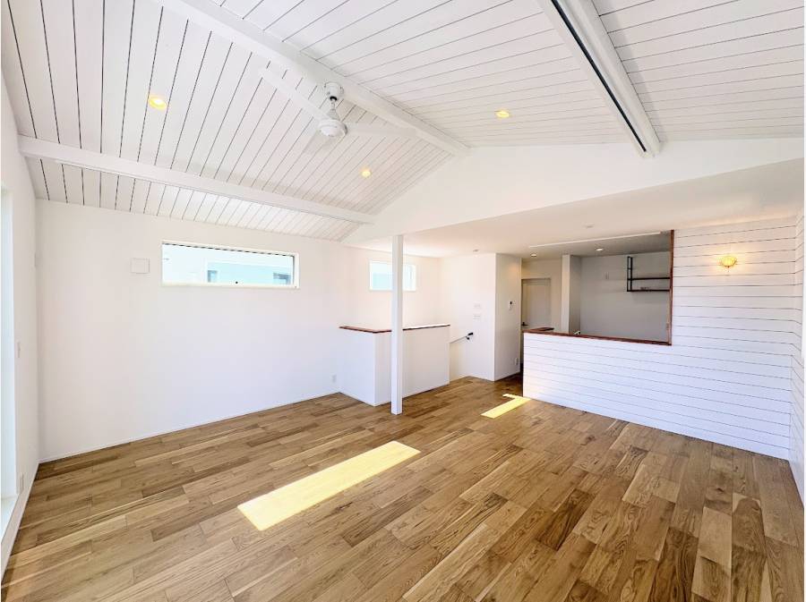 扉を開けると、約21帖の広々としたLDKが広がり、勾配天井が生み出す開放感が魅力です。ホワイトを基調とした洗練されたデザインが、日々の暮らしを特別な時間へと変えてくれる空間です。